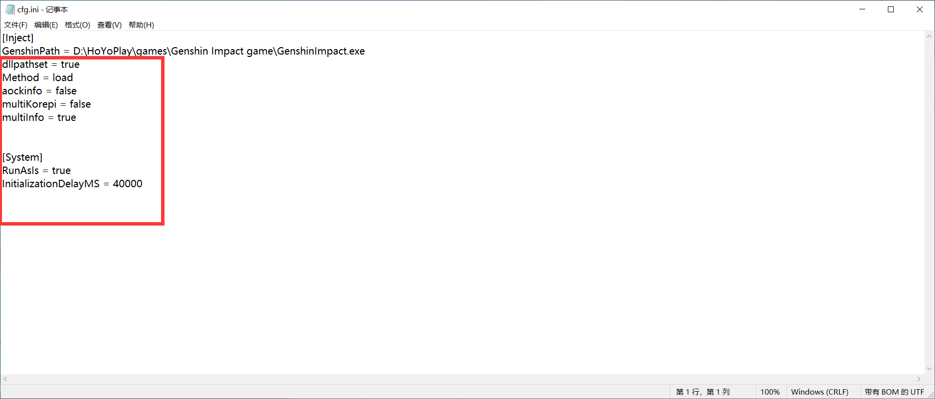 如果脚本启动失败,没有作用,手动打开cfg.ini把下面的内容手动添加进去,红框圈的