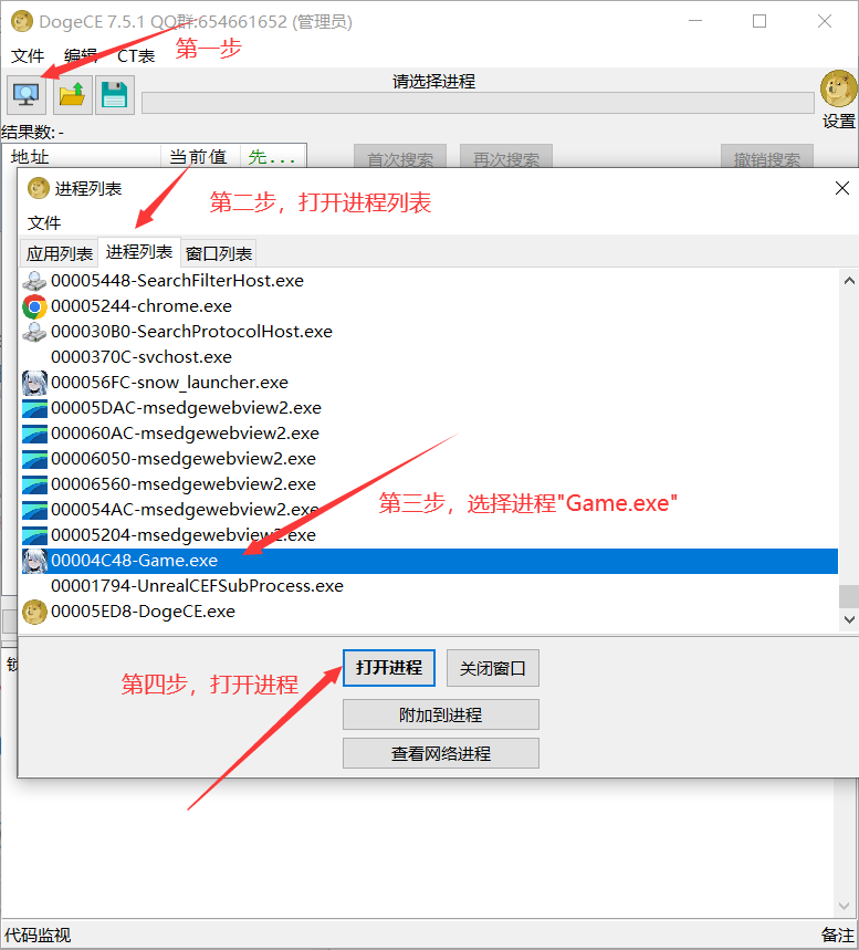 将文件解压到桌面1.以管理员方式运行“DogeCE.exe”,注意一定要以管理员方式运行2.打开游戏,然后使用CE的进程列表中选择白尘的进程“Game.exe”3.将CT表拖动到CE里面4.勾选菜单5.勾选功能并修改数值,例如,我们修改人物的速度“Speed”,把速度改到200具体还有什么功能自己探索尽量避免在超元链接或精神拟境模式中使用可能会封号