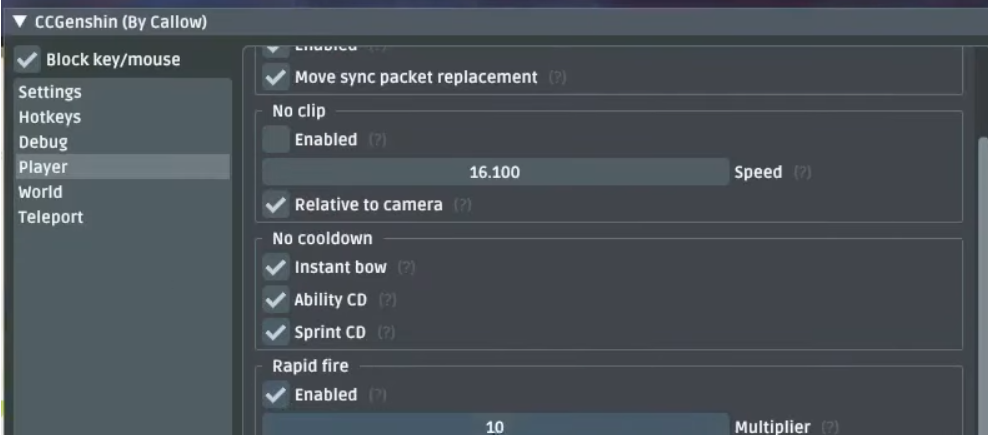 当前版本:0.5.1支持 Genshin Impact 版本:2.6功能:- 无敌模式- 敌人不攻击玩家- 快速攻击- 自动谈话- 无冷却时间- 穿墙模式- 自动拾取战利品- 无限冲刺- 地图传送,传送到眼和箱子- 杀死光环使用方法:1.先关闭Genshin2.管理员权限运行 injector.exe,选择GenshinImpact.exe(不是启动器)F1 = 显示|隐藏菜单