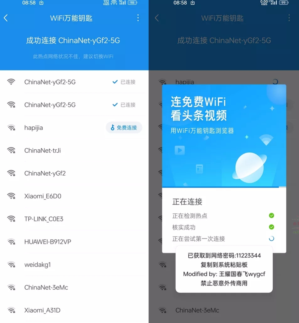 WiFi万能钥匙app应该说是最好的免费WiFi蹭网神器,但是无法查看密码记录,这是wifi钥匙美中不足的地方,虽说可以用其它工具获取,但终究是有点不爽和麻烦,为了弥补这个遗憾和瑕疵,因此特地硬改给增加了显示密码功能.注意wifi显密码版并非暴力破解密码,原理是通过收集的万能钥匙分享密码自动链接,再把这些数据共享.