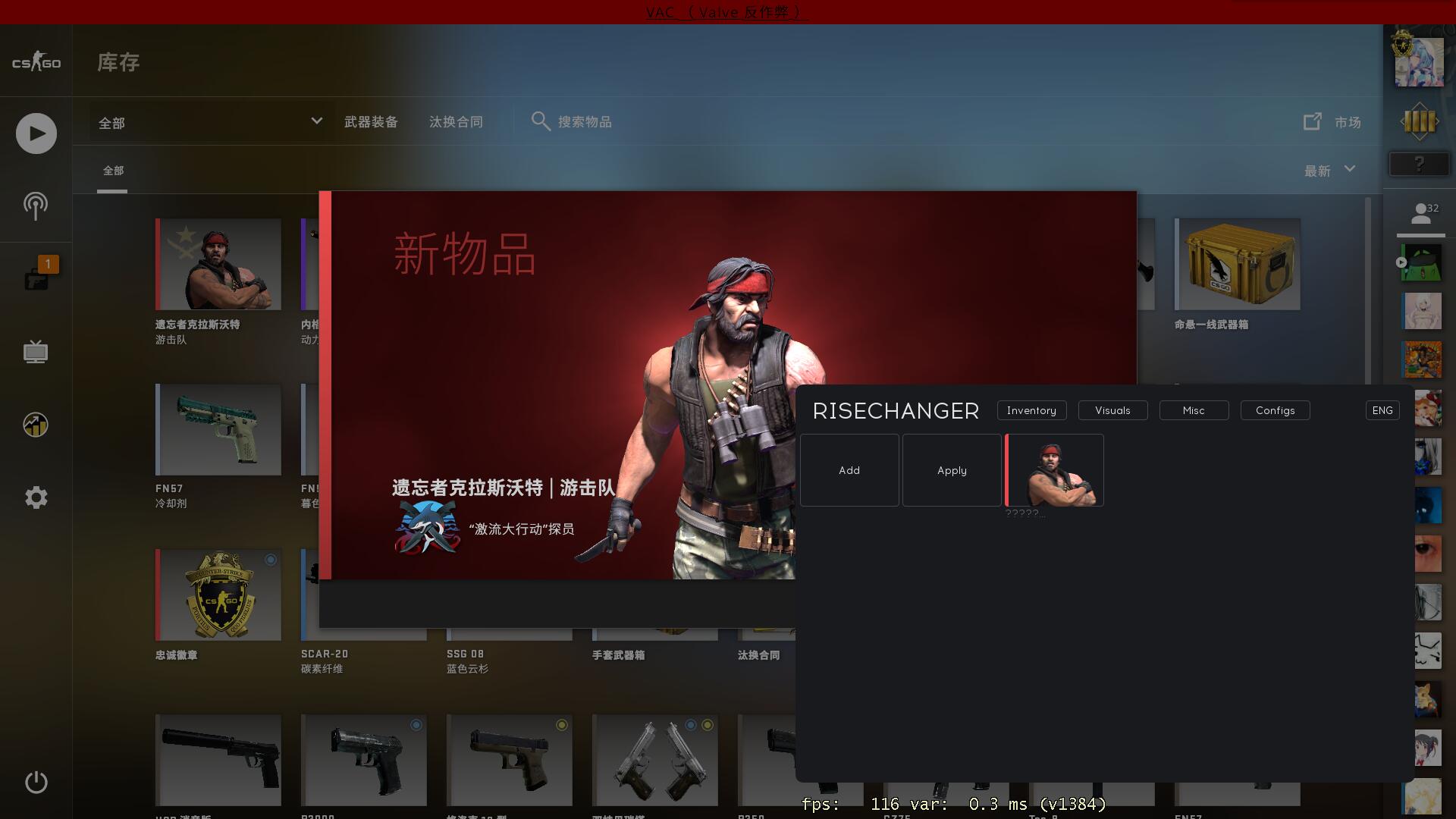 INS呼出隐藏菜单、Add添加武器或者人物皮肤,然后点击右侧的Apply应用即可。注意:目前DLL是安全的、被封号的概率很低,但是不能保证百分百不VAC。