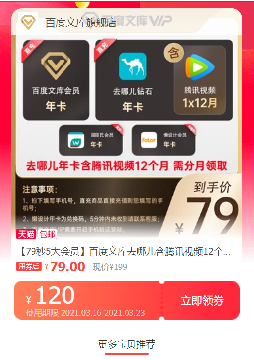 买1得5 79元含1年百度文库+1年腾讯视频+1年去哪儿钻石