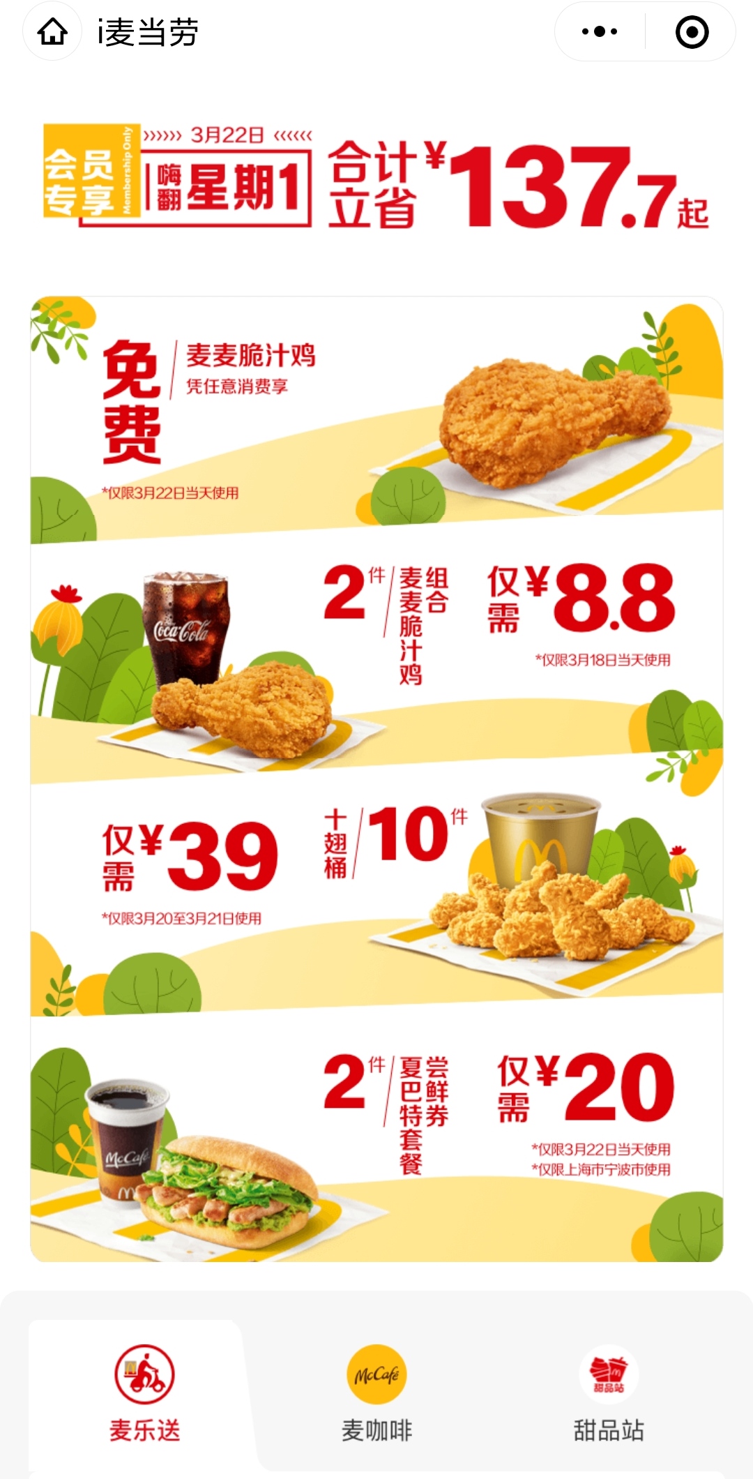 喜欢吃麦当劳的可以领取一下,领取到卡券即可,3.22日当天到店任意消费可使用‘