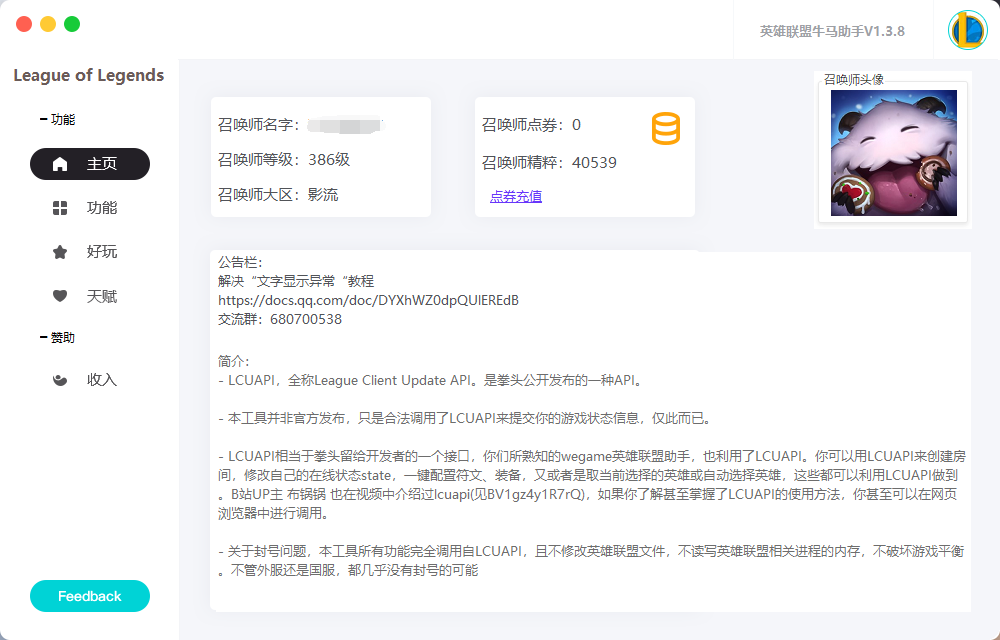 | LOL牛马助手v1.7.8(免费) 软件基于LCUAPI开发 理论上不会封号 经过不断迭代,已经解决了大部分的BUG了,如果还有问题可持续反馈给我,我尽量修复! 使用指南: 查询队友 - 在选人界面(或泉水) 按快捷键END/或者软件上的查询队友按钮 即自动发送战绩 查询敌人 - 在泉水按快捷键HOME/或在软件上按一下查询敌方按钮 (此时不要操作鼠标键盘等待发送!) 战绩详情 - 查完战绩后在软件界面上有查看详情的标签,点一下即可看见最近五场的游戏数据! 修改段位 - 打开游戏后直接点一下修改提示修改成功即可,若没效果,选择别的段位在修改一次即可,此功能并没有什么实际作用,只是装逼 天赋系统 - 此功能数据来自OP.GG若电脑无法访问则无法使用! 生涯背景修改 - 可修改你没有的皮肤或者英雄的图作为生涯背景图 换肤功能 - 先点击初始化然后选择皮肤点击使用即可 更新日志: 1.[修复] 发送指定用户信息提示发送失败