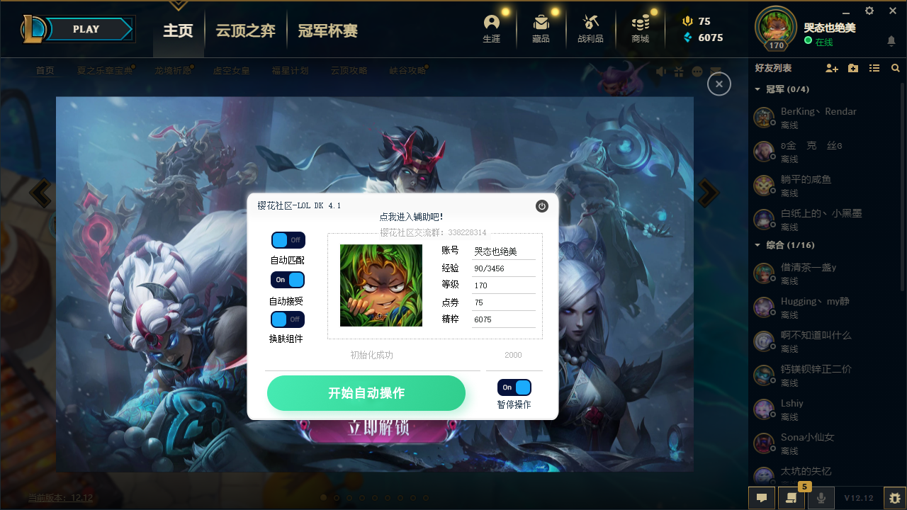 -----------------------特别注意,如果你开启自动寻找对局 接受对局等功能,请选择好英雄后点击暂停,因为是一直循环的,会导致软件假死!下一把点继续即可
