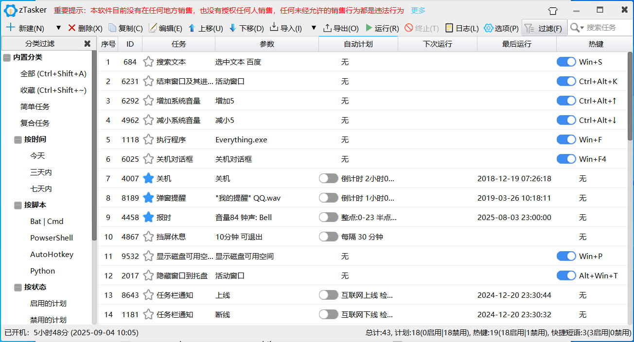 zTasker是一款完全免费支持定时、热键或条件触发的方式执行多种自动化任务的小工具,支持win7-11。其支持超过100种任务类型,50+种定时/条件执行方法,而且任务列表可以随意编辑、排列、移动、更改类型,支持任务执行日志,可覆盖win自带的热键,同时支持任务列表等数据的备份及自动更新等。