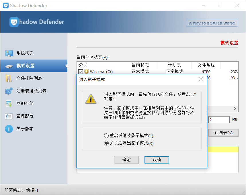 Shadow Defender(简称SD,中文名:影子卫士)是一款体积小巧,但是功能却非常强大的影子系统软件,它的工作原理类似于沙盘就是让所有软件运行在虚拟的系统环境影子模式中,任何操作均不会改变你的真实环境。相对其它系统还原保护软件,其最大的特色是支持保护单独指定分区(或多分区),支持文件排除,以及即时转储等功能,可以把处于影子模式中的文件或文件夹置入排除列表,所有更改将被保存到原始分区。它占用系统资源非常低,关闭软件进程后保护依然有效,特别是在转储和排除方面胜人一筹。
