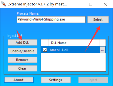 steam.dll/xbox.dll分别代表steam平台和xbox平台使用的dll把dll和注入器解压出来以管理员方式运行注入器打开游戏,选择游戏进程“Palworld-Win64-Shipping.exe”,选择dll点击“inject”注入即可