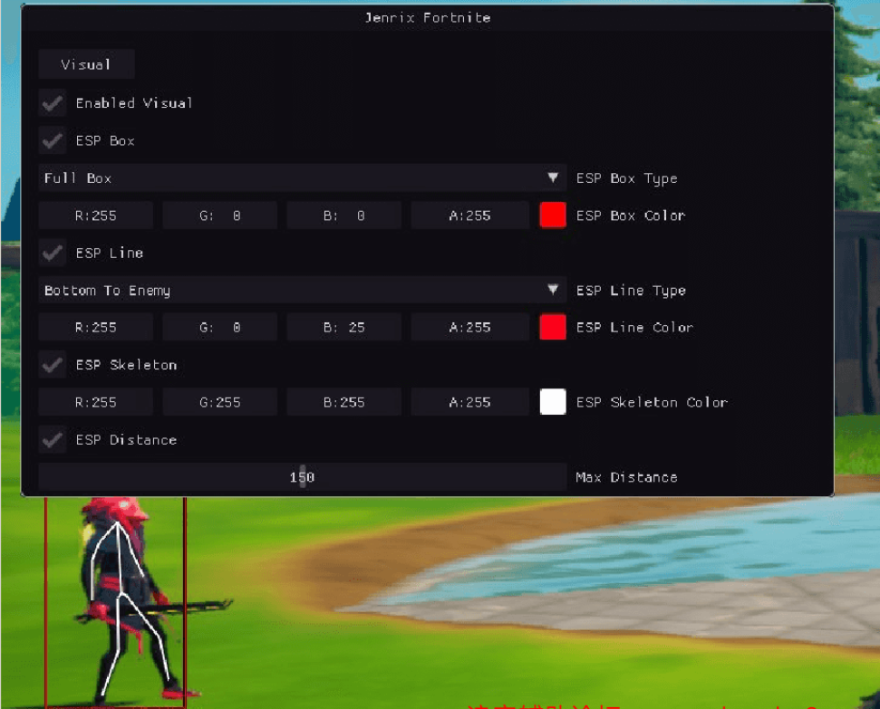 我想与您分享来自开发商 JenriX 的 Fortnite 游戏的免费作弊。这是一个独特的秘籍,有自己的菜单,您可以使用它来控制黑客的功能。有这样一些有趣的功能:ESP,ESP Line,ESP Distance,ESP Box。由于此功能,您将能够通过地图上的纹理看到您的敌人,换句话说,对手将在离您任何距离的地方被突出显示和突出显示,因此您将知道他们的位置。