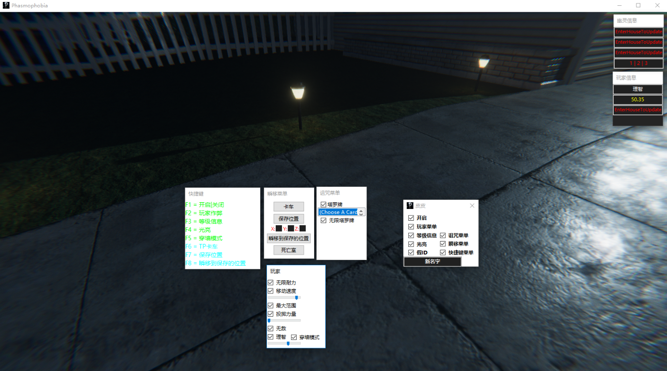 功能:新名称-修改玩家名字无限耐力移动速度修改最大范围投掷力量无敌理智值修改穿墙模式等级信息(显示幽灵信息 和 玩家信息)幽灵信息(幽灵名称、幽灵类型、幽灵当前位置、证据)玩家信息(理智、当前房间)光亮假ID(将Steam ID 更改为空)快捷键菜单瞬移(瞬移到卡车、到死亡室、到自定义位置)无限塔罗牌