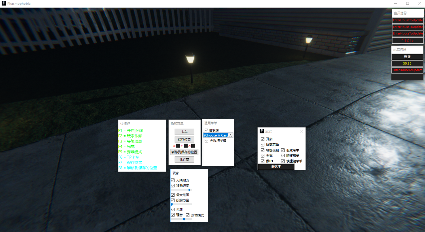 支持版本:0.6.2.2功能:新名称-修改玩家名字无限耐力移动速度修改最大范围投掷力量无敌理智值修改穿墙模式等级信息(显示幽灵信息 和 玩家信息)幽灵信息(幽灵名称、幽灵类型、幽灵当前位置、证据)玩家信息(理智、当前房间)光亮假ID(将Steam ID 更改为空)快捷键菜单瞬移(瞬移到卡车、到死亡室、到自定义位置)无限塔罗牌