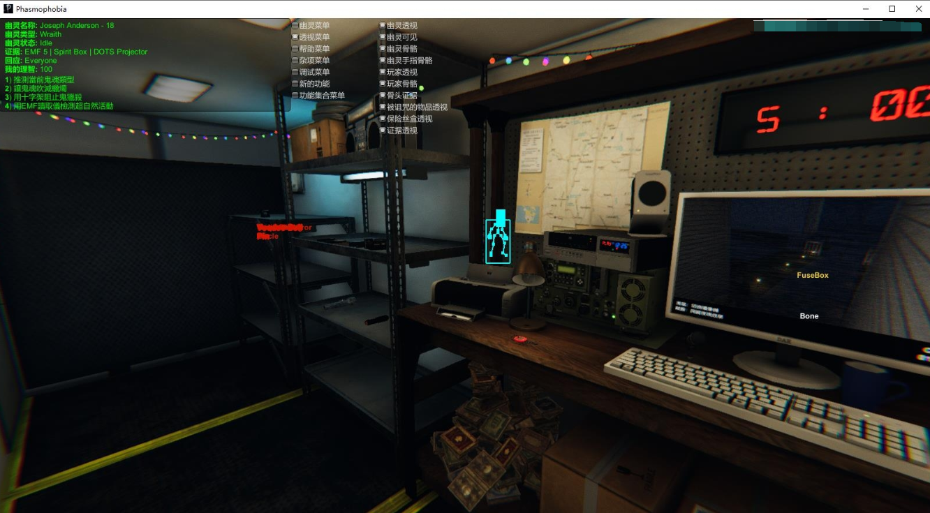 支持版本:v0.7.1.5快捷键:INS| DEL| 右Ctrl | →:打开菜单↑:透视←:基本信息↓:全亮H:强制幽灵猎杀I键:强制鬼与门/书/物体互动O键:强制出现鬼影P=强制鬼停止猎杀/出现L=锁定所有出口门U=解锁所有出口门如果出现闪退,代表游戏更新了