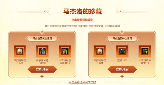 每日登录游戏1次和每日通关1次推荐地下城都可领取奖励,累计完成每日登录游戏达到7、14次时即可领取15天黑钻