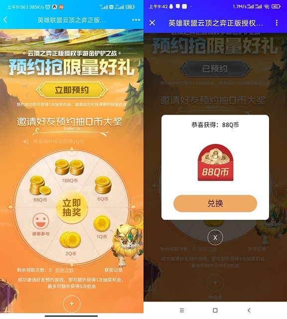预约云顶之奕手游抽Q币 亲测88Q币手机打开链接进入活动 下载腾讯手机管家,跳转至APP参与活动预约游戏即可获得一次抽奖机会!抽奖非必中,小编亲测88Q币 还可邀请好友预约获得最多5次抽奖机会!活动地址:https://sourl.cn/p8xAdM手Q扫码: