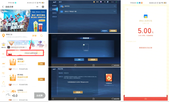 王者荣耀部分小号免费领5-20元现金红包微信小程序搜索【CoCo都可手机点单】 自助点单选择饮品。先随便个商品券 然后绑定王者角色然后看中间横幅有没有【抽奖必得5-20】有就领取 领取后去王者荣耀邮件里兑换即可,手机没游戏的可去先游登录!活动地址:微信小程序搜索【CoCo都可手机点单】
