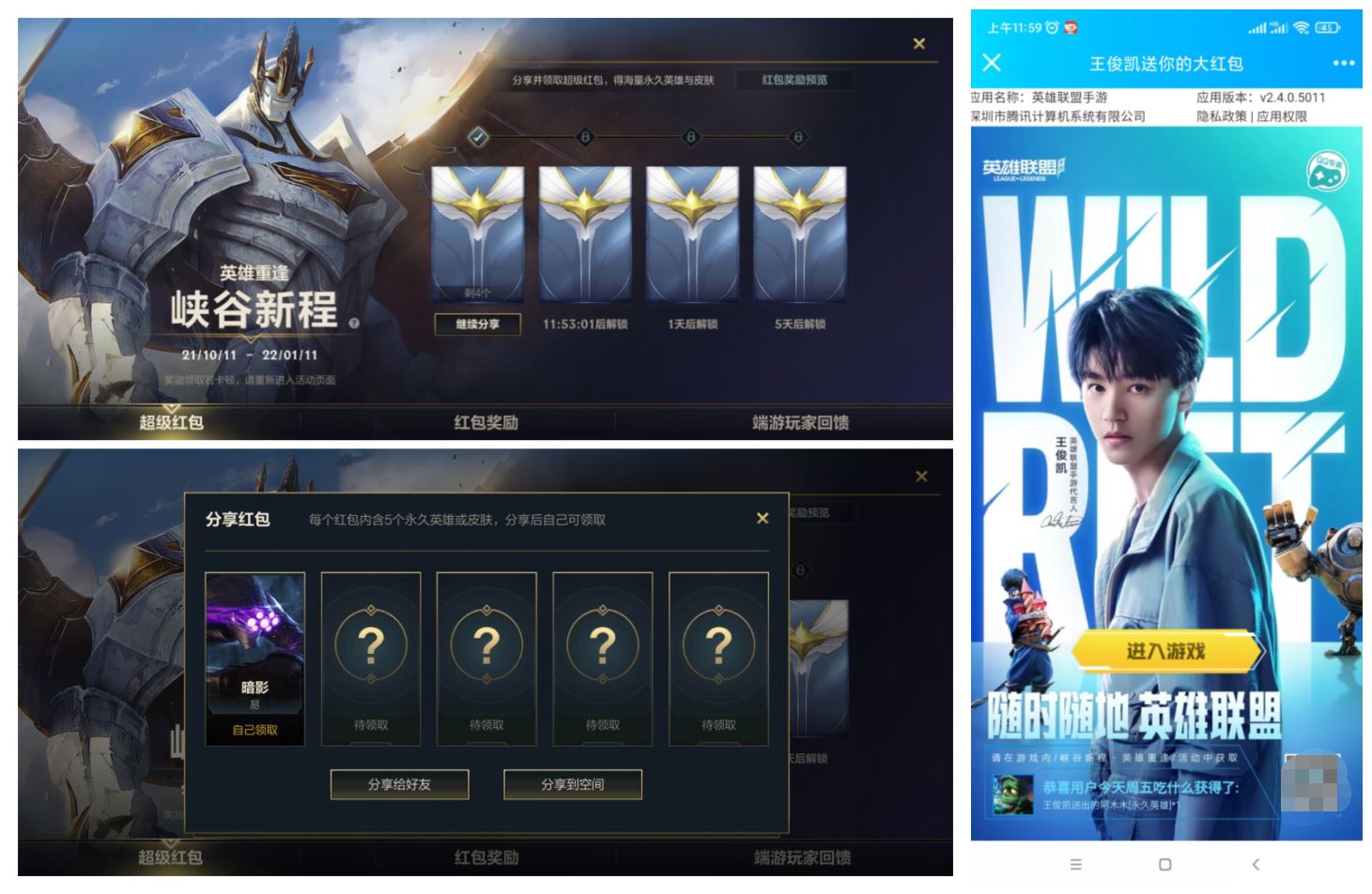 2、活动->峡谷新征程->可以分享给好友和自己领->领了后需要玩一局游戏才能在红包奖励里解锁