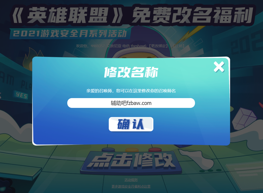 在游戏安全月活动期间内,每个 QQ 账户下的每个游戏大区角色,可以在活动页面进行一次免费改名。所有的改名机会均只在本活动期间内有效,免费改名将遵守改名系统的所有规则,改名卡下架期间不可使用改名机会。