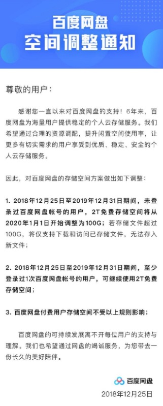 1、2018年12月25日至2019年12月31日期间,未登录过百度网盘帐号的用户,2T免费存储空间将从2020年1月1日开始调整为100G;若存储文件超过100G,将仅支持下载和访问已存储文件,无法存入新文件;