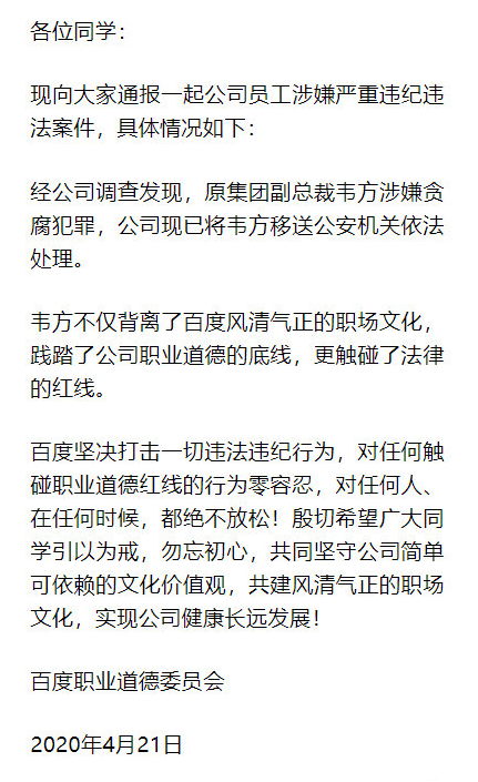 新京报讯(记者 陆一夫)4月21日,百度职业道德委员会通报了一起员工涉嫌严重违纪违法案件,原百度集团副总裁韦方经公司调查发现涉嫌贪腐犯罪,现已被移送公安机关依法处理。