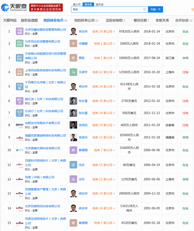 天眼查信息显示,百度副总裁韦方本人目前任高管的公司共有15家,包括北京百度网讯科技有限公司、百度在线网络技术(北京)有限公司、百度(中国)有限公司、百度时代网络技术(北京)有限公司等,不过职位均为监事。